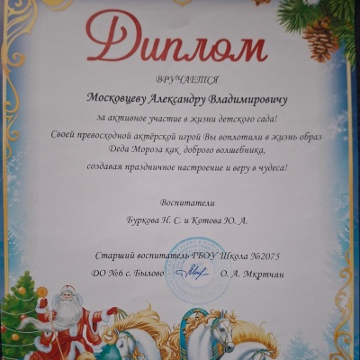 Александр — опытный актёр со стажем театральной деятельности более 5 лет. В роли Деда Мороза выступает на утренниках в детских садах и школах, в театральных постановках и на частных праздниках. Его уверенная подача, тёплая харизма и умение работать с детской аудиторией дарят атмосферу настоящего чуда.