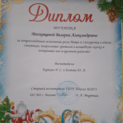 Валерия — талантливая артистка коллектива «Арлекин» с опытом более 3 лет. В роли Снегурочки она создаёт мягкий светлый образ, вовлекает детей в игру и помогает сделать каждое выступление по-настоящему ярким и волшебным.